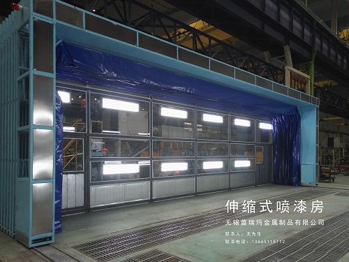 伸缩式喷漆房简介 伸缩移动式工作区是专门为解决较大型工件搬运周转困难而研发的实用性产品,除具有传统喷漆房的密闭、通风、除漆雾功能外,该喷漆房可伸缩,喷漆的空间可变大变小,生产工艺上简化了不断用车间行车周转吊运的生产工序;操作使用简单方便,整体为框架传动结构,每组框架间均由阻燃PVC布密封连接,安装快捷、外形美观;工作中伸缩移动房体沿地面铺设的轨道伸缩行走,采用两边分别驱动,互相连锁的方式运行,机械运行安全稳定;工作区内安装有照明灯,可满足生产中的照度需要;可根据用户的实际生产需要定制各种型号的非标尺寸。